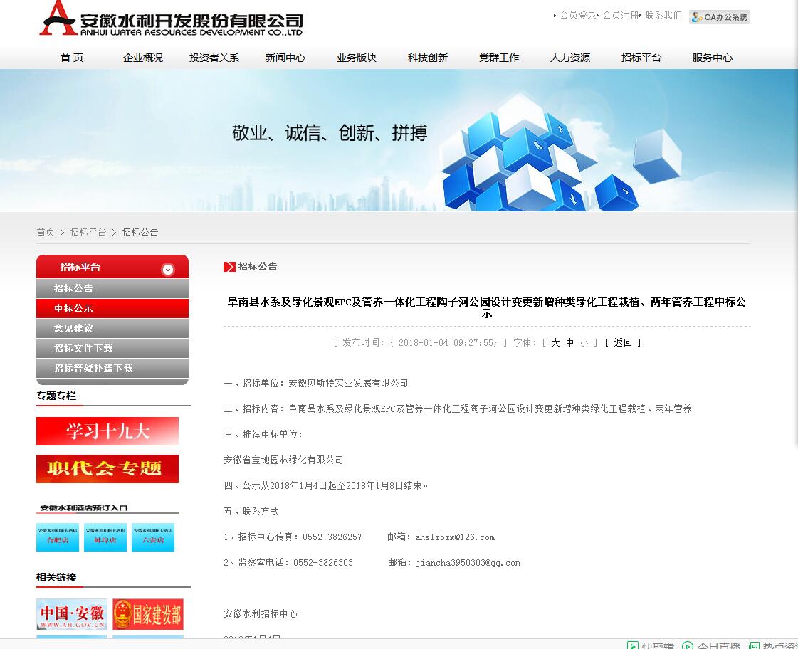 祝贺我公司中标阜南县水系及绿化景观EPC及管养一体化工程陶子河公园设计变更新增种类绿化工程栽植、两年管养工程,该工程中标价为一千六百万。系阜阳市重点工程。