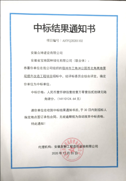 庆祝本公司中标(宿州市三角洲公园西北角高地景观绿化提升改造工程)项目!!!